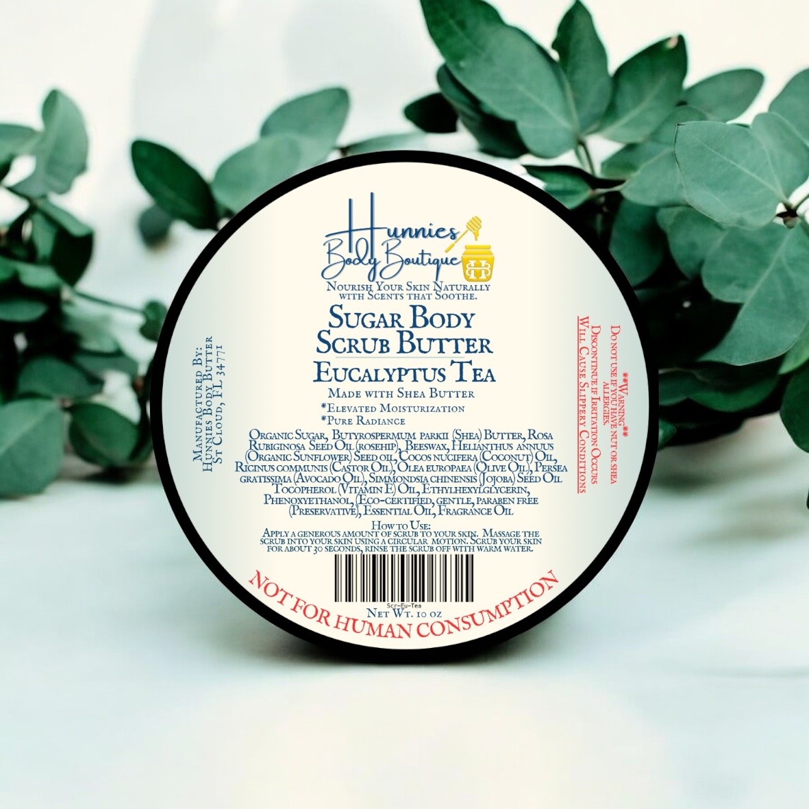 Our Eucalyptus Tea Sugar Body Scrub Butter is an energizing yet calming exfoliating treatment that breathes new life into tired skin. This refreshing scent combines crisp lemon zest, cooling spearmint, and soothing eucalyptus with delicate floral notes and sheer musk for a clean, spa-like experience. It’s crisp, clean, and calming all in one.