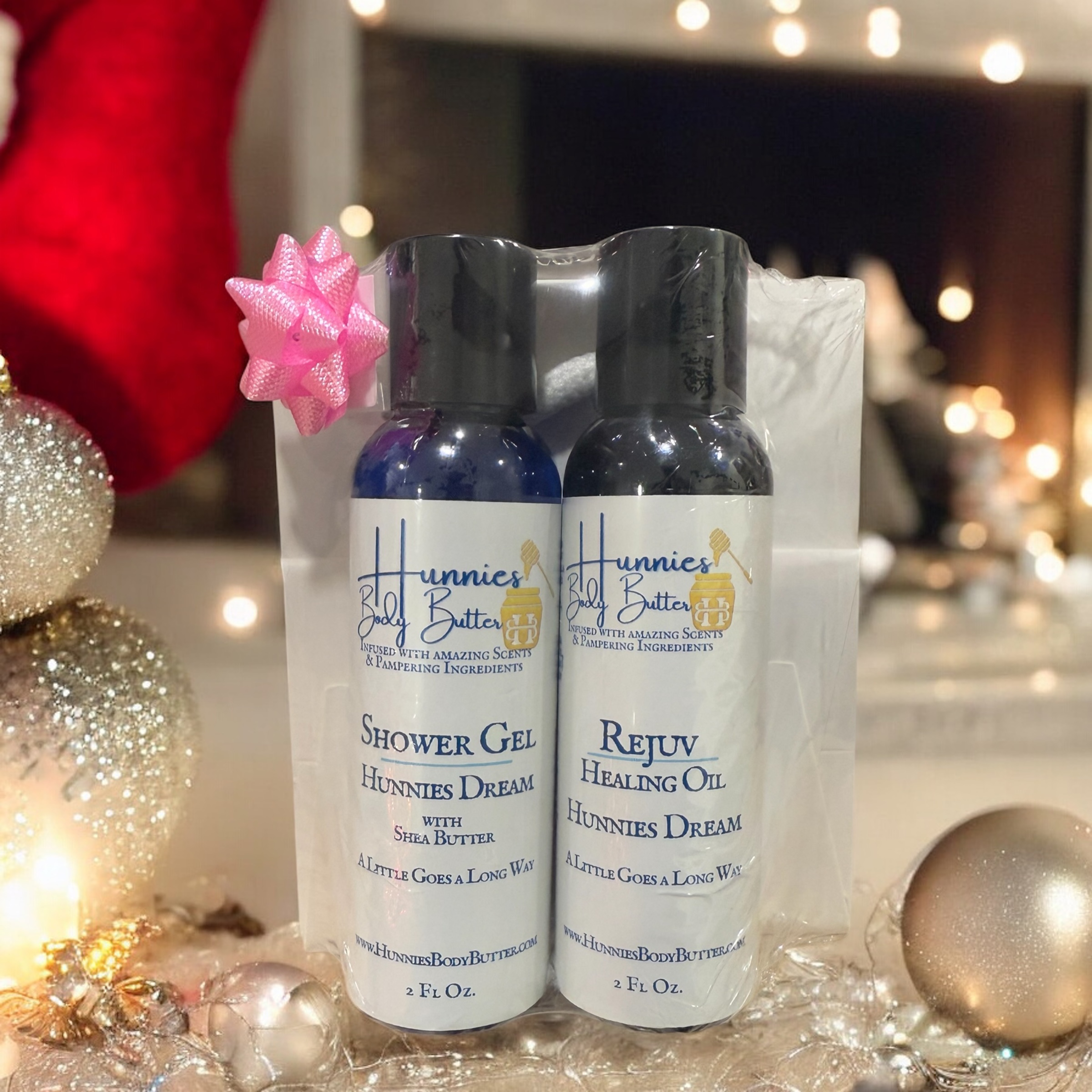 Spread holiday cheer with our Hunnies Christmas Gift Set! This delightful set includes a 2oz Shower Gel, a 2oz Rejuv Oil, and a gift bag—perfect for gifting or treating yourself. Experience the nourishing touch of natural ingredients and the comforting scents that make this season bright. Available in Eucalyptus Mint, Hunnies Dream, Cherry Almond, or Creamy Coconut.
